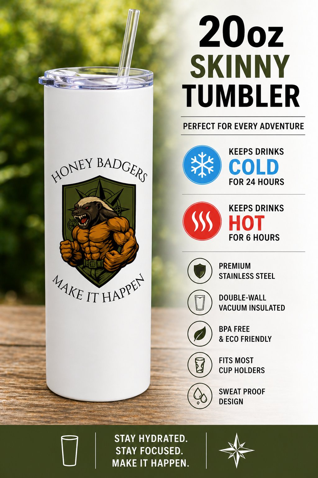Stay ready, stay focused, and represent with confidence using our 20oz Skinny Stainless Steel Tumbler, designed for performance and everyday durability. Featuring the bold Honey Badgers “Make It Happen” design, this tumbler is built for those who move with purpose.