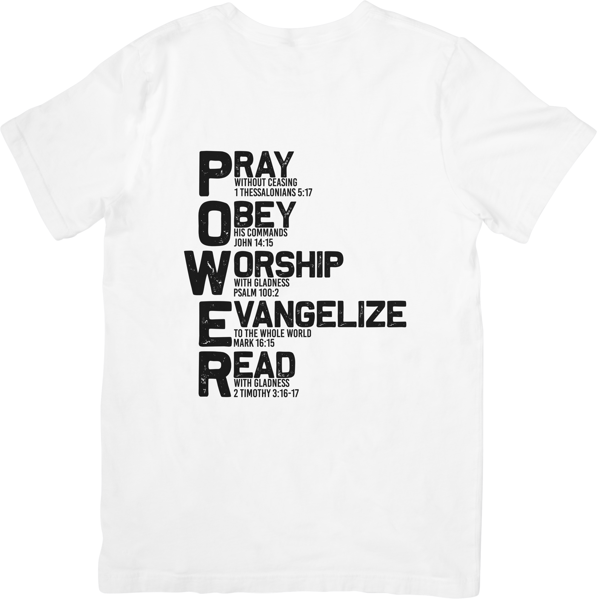 POWER Christian Shirt – Pray, Obey, Worship, Evangelize, Read