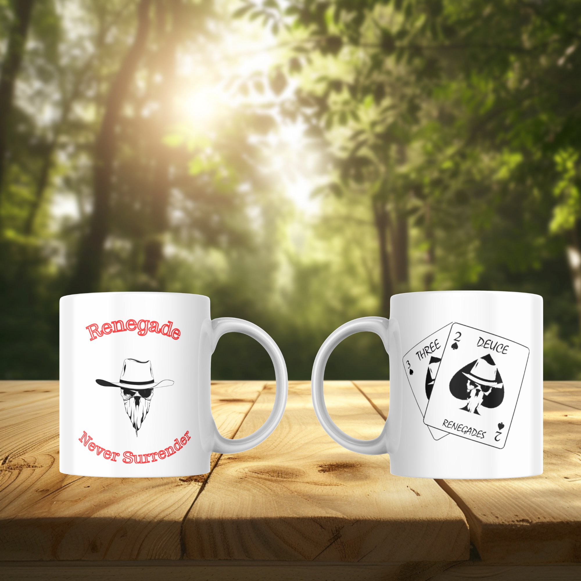 Featuring the Renegades logo and “Never Surrender” on one side and the iconic Renegades playing card design on the other, this mug delivers a bold, professional look that represents strength, resilience, and unit pride. Crafted from high-quality ceramic, it’s built to withstand daily use while maintaining vibrant, long-lasting prints.
