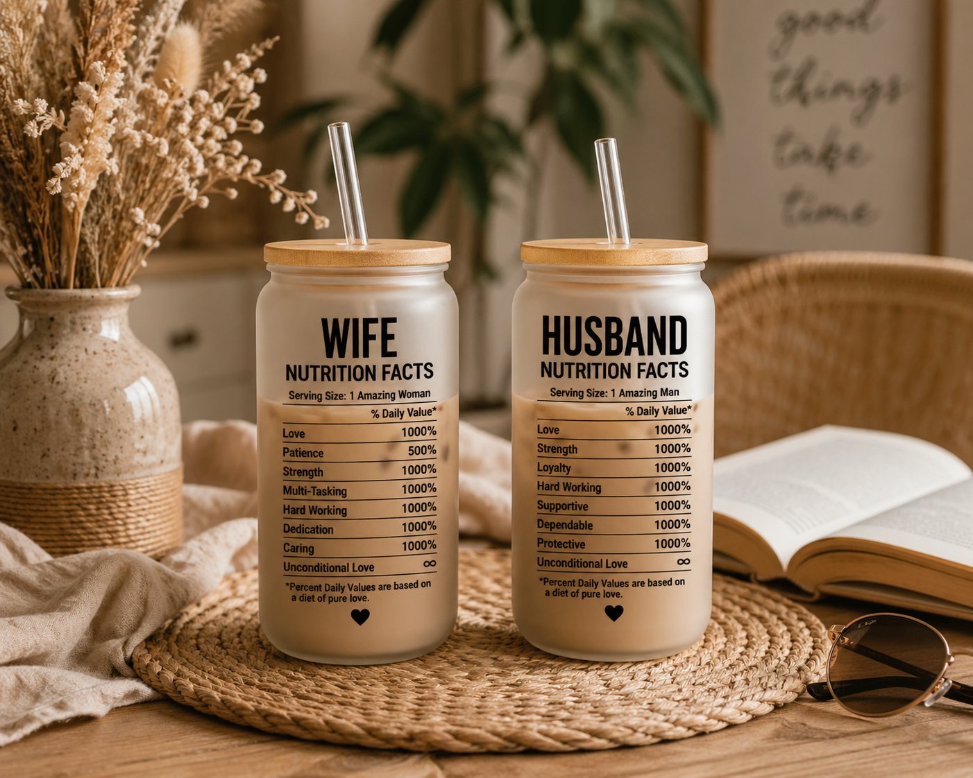 Our His & Hers Nutrition Facts Glass Tumbler Set takes everything you love about your partner and turns it into a fun, meaningful, and completely unique design. Featuring a playful “nutrition label” style, each tumbler highlights the qualities that make your relationship special—like love, strength, patience, loyalty, and unconditional love.